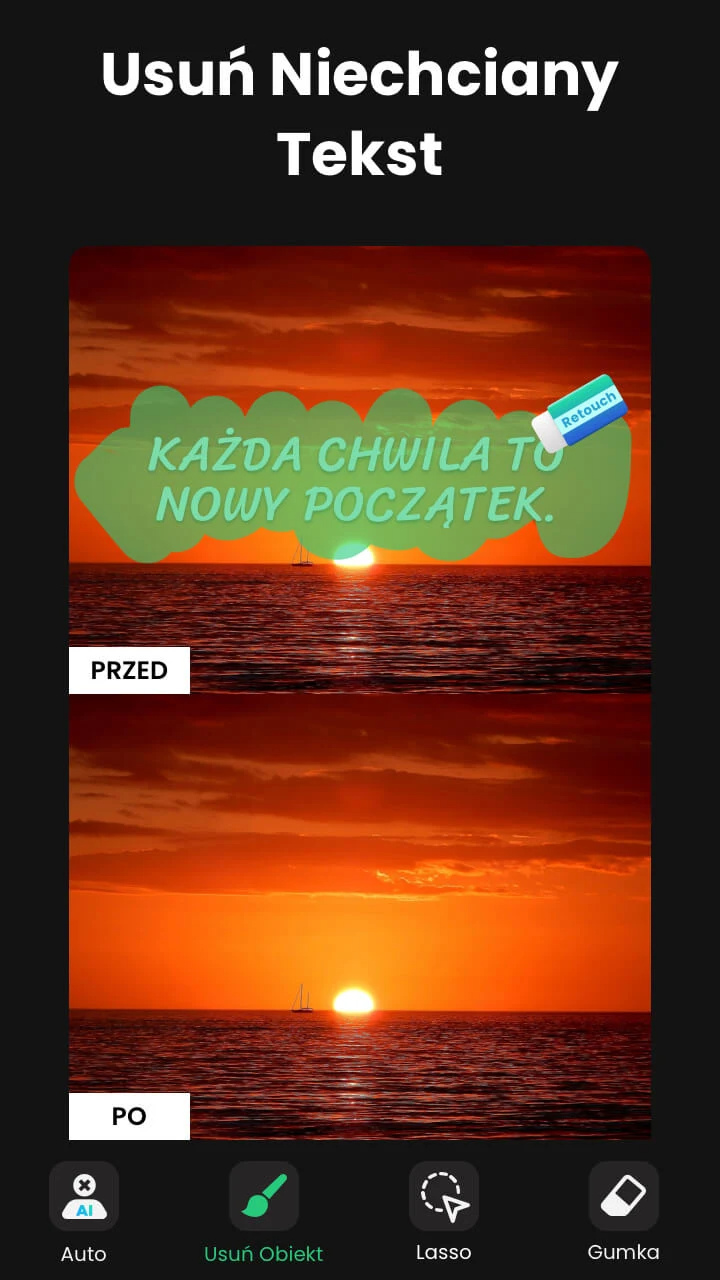 Usuwanie Elementów ze Zdjęcia to nowoczesna aplikacja mobilna umożliwiająca szybkie i precyzyjne usuwanie niechcianych obiektów z fotografii. Dzięki wykorzystaniu inteligentnych narzędzi retuszu użytkownik może w kilka chwil pozbyć się osób w tle, zbędnych przedmiotów, napisów czy niedoskonałości — bez potrzeby korzystania z zaawansowanych programów graficznych.
