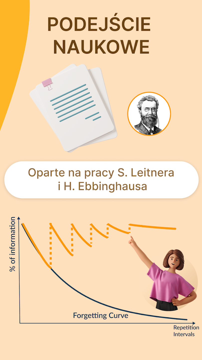 Fiszki słówka wykorzystują mechanizm powtórek oparty na krzywej zapominania. Dzięki temu aplikacja przypomina słówka dokładnie wtedy, gdy istnieje ryzyko ich zapomnienia.