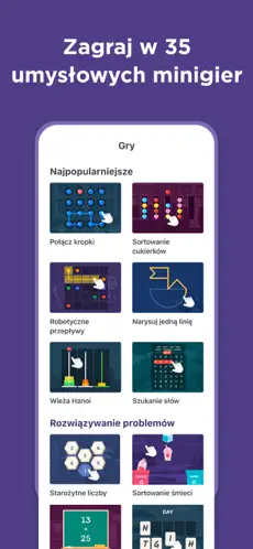 W aplikacji znajduje się kilkadziesiąt różnych minigier, które trenują różne części mózgu — od szybkich reakcji po skomplikowane zadania logiczne.