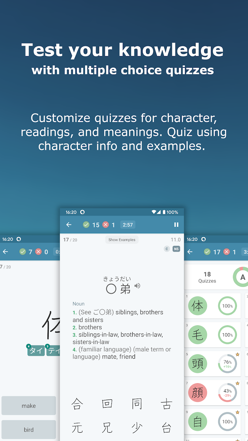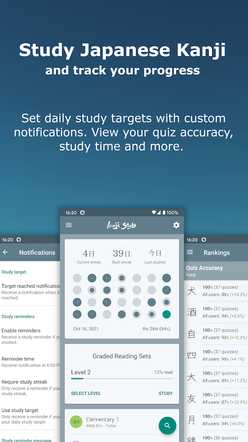 Japanese Kanji Study oferuje testy oraz system powtórek, który pomaga utrwalać materiał i monitorować postępy w nauce.