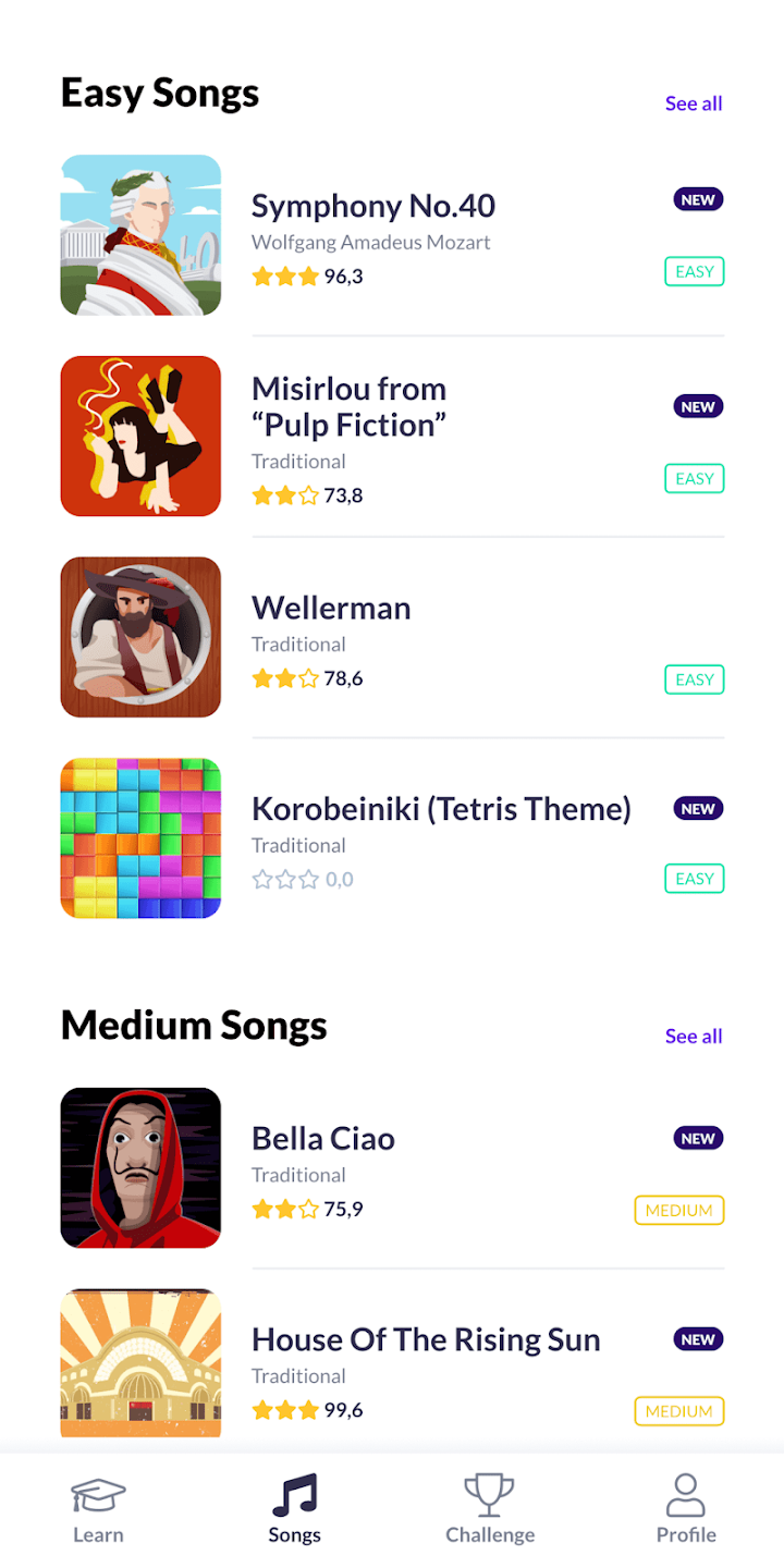 Użytkownik może ćwiczyć z prawdziwymi zapisami nutowymi oraz akompaniamentem, co pomaga rozwijać poczucie rytmu i muzykalność.