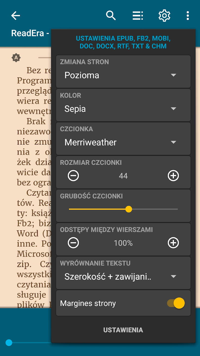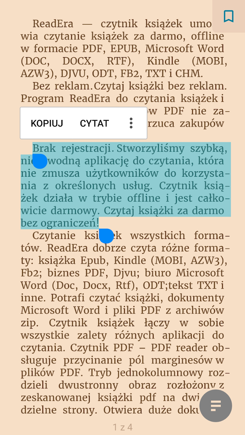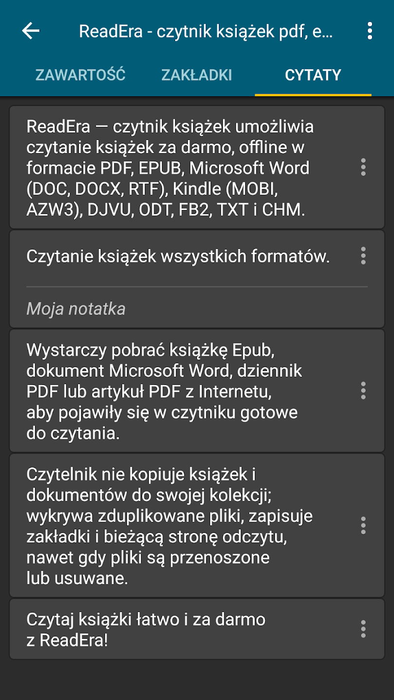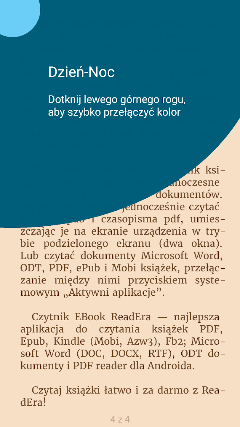 • Obsługa wielu formatów – czytaj pliki EPUB, PDF, DOC, DOCX, TXT, FB2, DJVU, MOBI i CHM bez konieczności konwertowania.