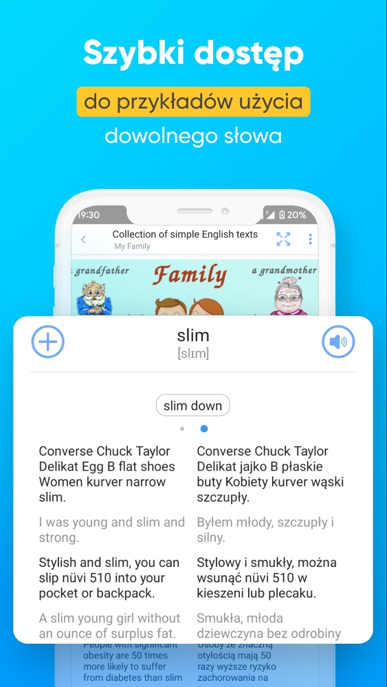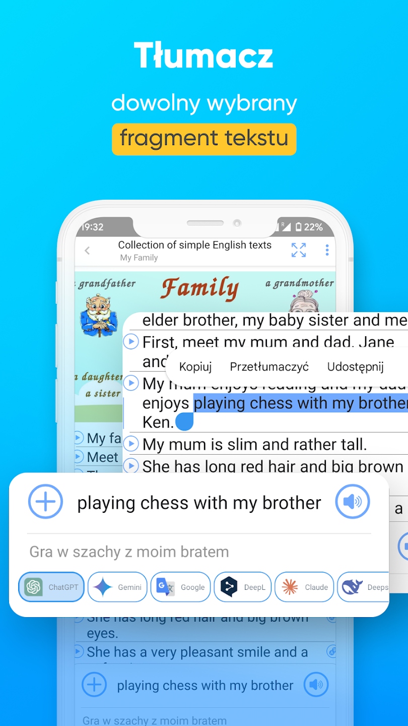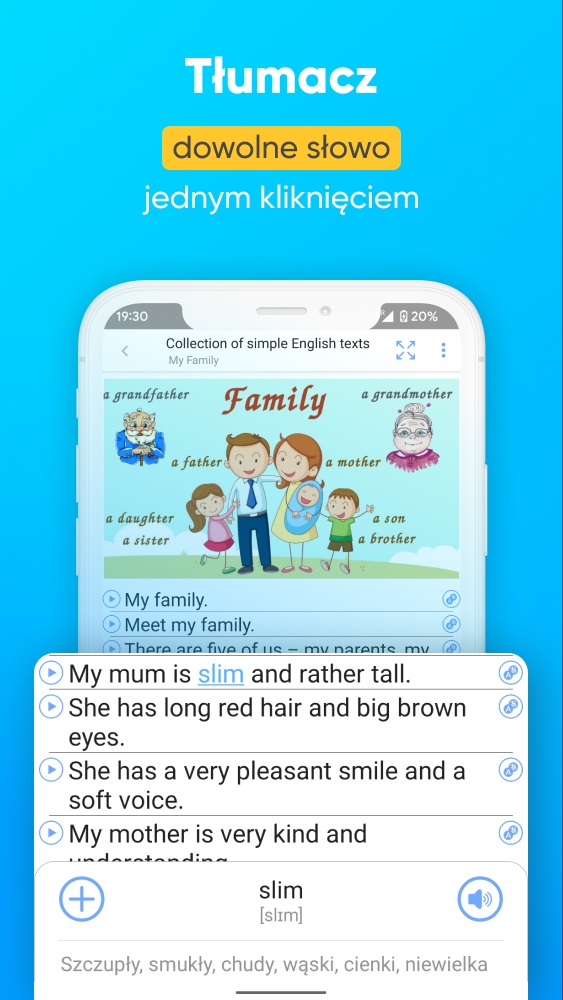 Klikając na wybrane słowo, możesz natychmiast zobaczyć jego tłumaczenie i znaczenie.
