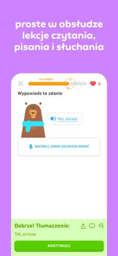- Zabawna i skuteczna nauka języków – Grywalizowane lekcje i ciekawe postacie sprawiają, że nauka mówienia, czytania, słuchania i pisania jest przyjemnością.