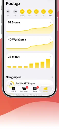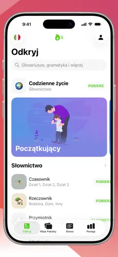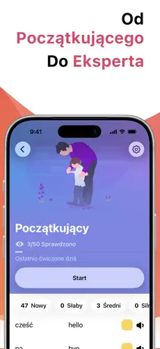 Aplikacja została zaprojektowana z myślą o osobach, które chcą uczyć się języka regularnie, nawet po kilka minut dziennie.