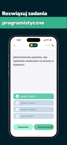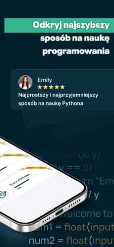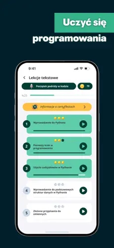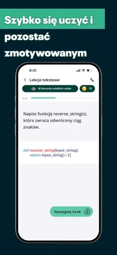 Aplikacja oferuje krótkie i zrozumiałe lekcje, które wprowadzają użytkownika w świat programowania krok po kroku.