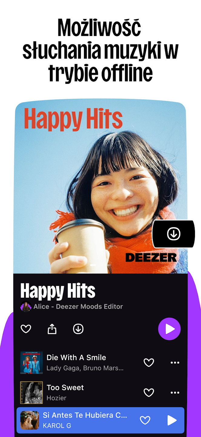 Deezer to popularna aplikacja streamingowa, która oferuje dostęp do milionów utworów muzycznych, setek playlist oraz różnorodnych podcastów z całego świata. Dzięki Deezer możesz słuchać ulubionej muzyki w dowolnym miejscu i czasie, tworzyć własne listy odtwarzania oraz odkrywać nowe brzmienia dopasowane do Twojego gustu.