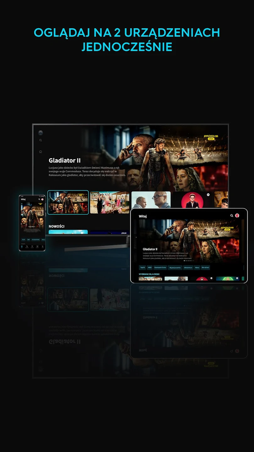 Dostęp na wielu urządzeniach: Platforma dostępna przez przeglądarkę, aplikacje na Android, iOS, Android TV, Apple TV, PlayStation, VIDAA, Tizen, webOS i inne.