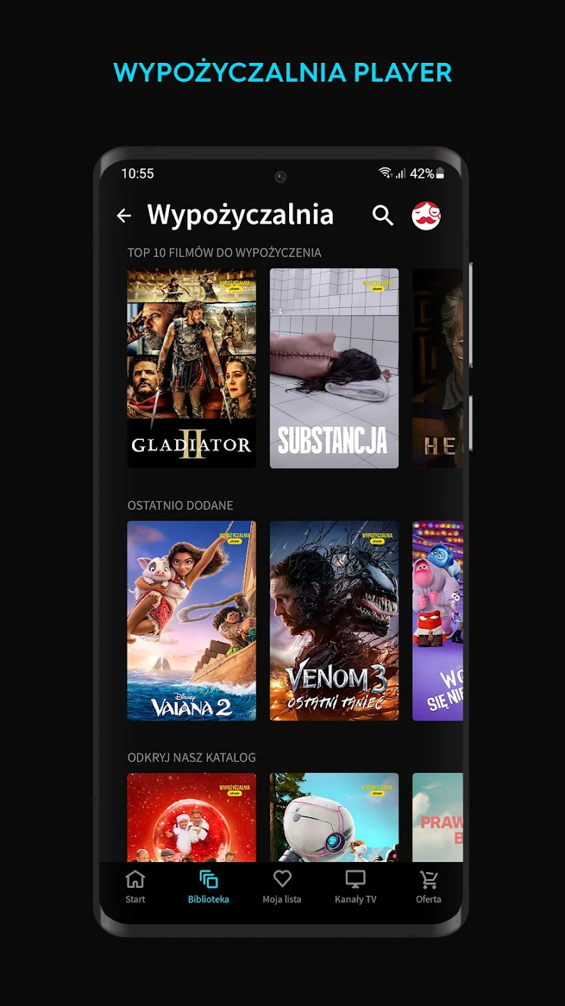 Bogaty katalog filmów: Około 300 filmów fabularnych w różnych gatunkach.