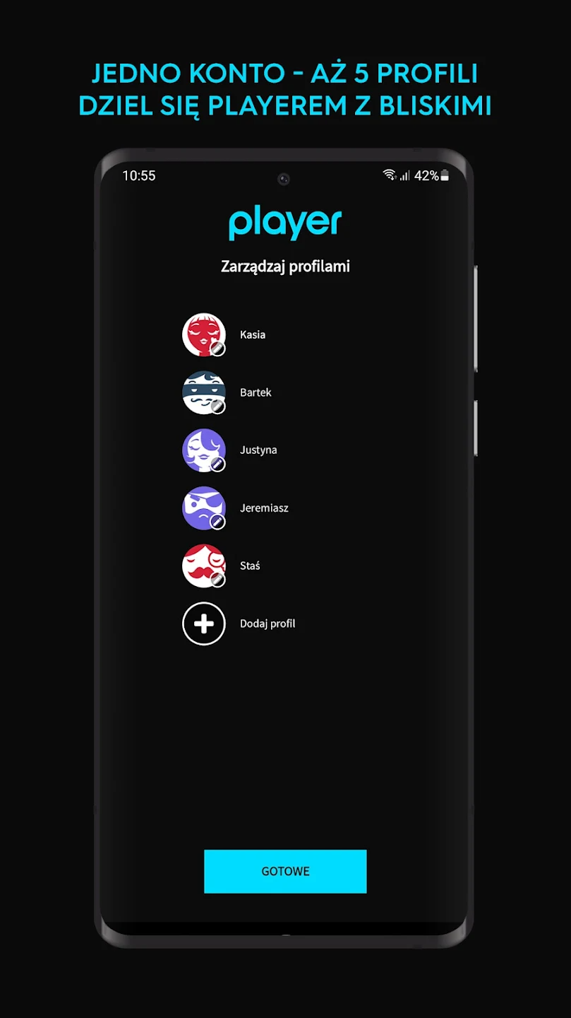 Konta i profile: Możliwość tworzenia do 5 profili w ramach jednego konta.