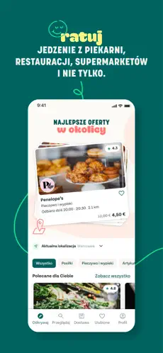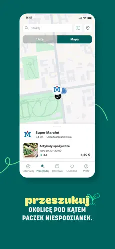 Pobierz aplikację i przeglądaj mapę z pobliskimi restauracjami, kawiarniami, piekarniami, supermarketami i zaufanymi markami oferującymi niesprzedaną, ale wciąż świeżą i pyszną żywność w rewelacyjnych cenach.
