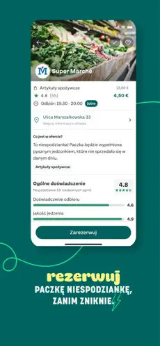 Potwierdź zakup w aplikacji, aby zarezerwować swoją paczkę i uratować jedzenie przed zmarnowaniem. Oszczędzasz pieniądze i pomagasz w walce z marnotrawstwem.