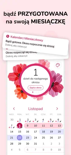 Funkcja alertów informuje o zbliżającym się okresie lub ważnych dniach cyklu.