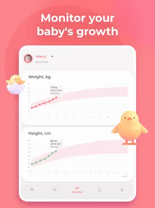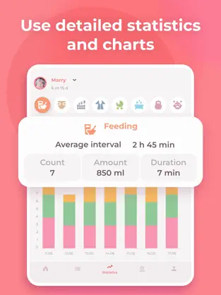 • Statystyki i raporty – przejrzyste wykresy i podsumowania pomagają śledzić postępy oraz wspierają konsultacje z pediatrą czy doradcą laktacyjnym.