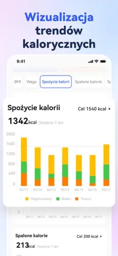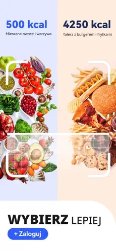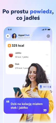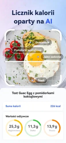 Aplikacja pozwala na analizę jedzenia na podstawie zdjęcia lub opisu, automatycznie obliczając kalorie i wartości odżywcze.
