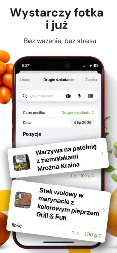 Wpisz posiłki, które spożywasz w ciągu dnia, a aplikacja automatycznie obliczy ich wartość kaloryczną i makroskładniki.