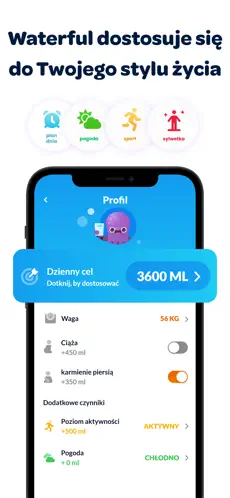 Waterful automatycznie oblicza zalecane dzienne spożycie wody na podstawie takich danych jak waga, płeć, poziom aktywności fizycznej czy warunki pogodowe.