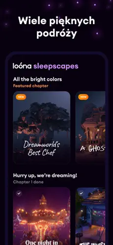 Jedną z największych zalet aplikacji Loóna są specjalnie zaprojektowane historie do słuchania przed snem. Krótkie, uspokajające narracje:
