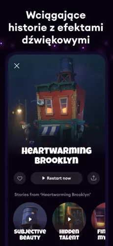Aplikacja łączy relaksujące historie, spokojną narrację oraz delikatne elementy wizualne, pomagając oderwać myśli od codziennych zmartwień.