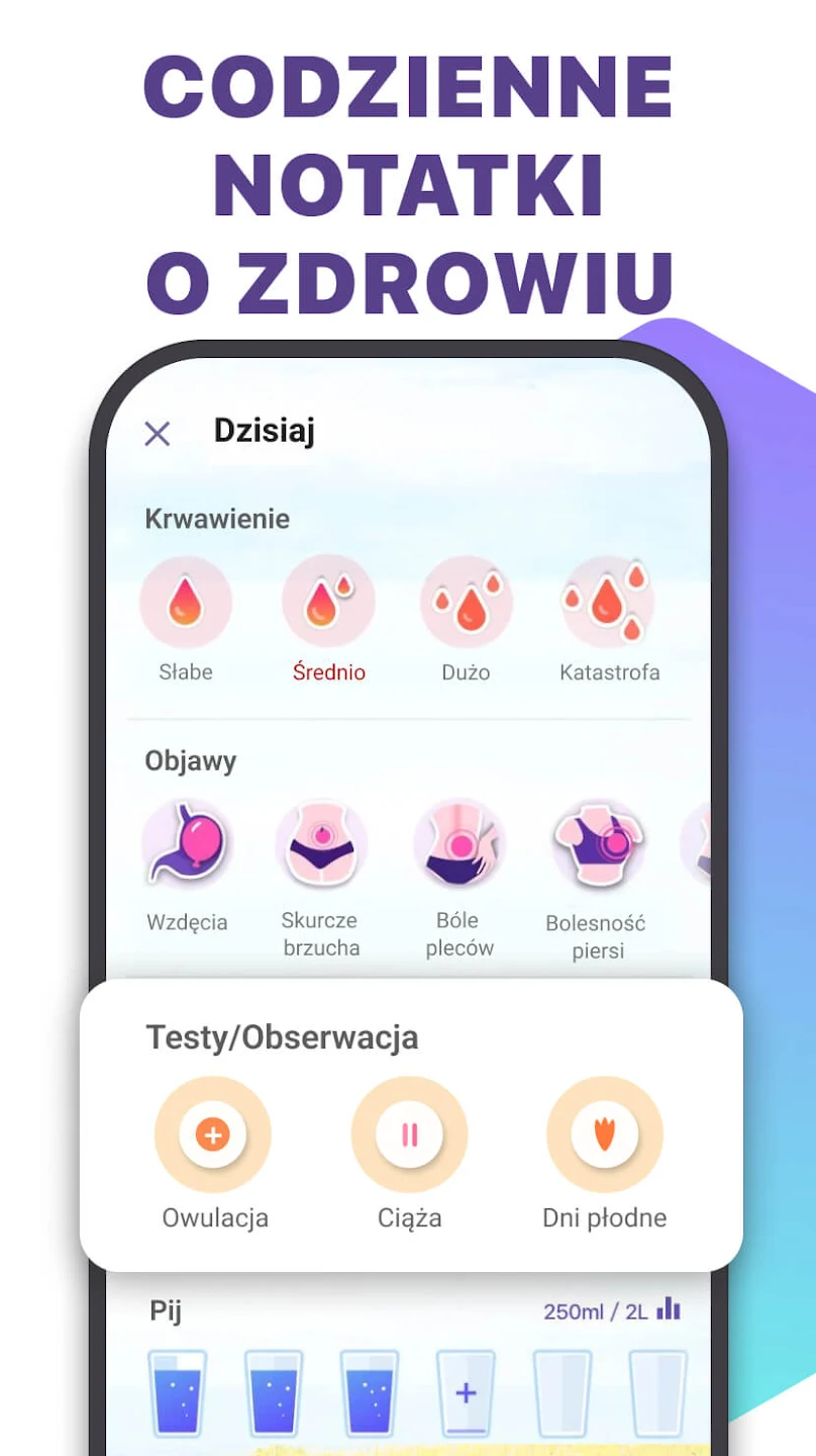 Użytkowniczki mogą zapisywać samopoczucie, objawy fizyczne oraz inne obserwacje związane z cyklem.