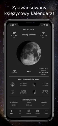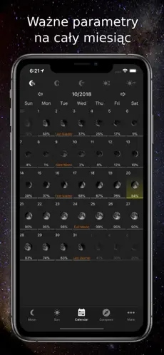 Wbudowany kalendarz umożliwia sprawdzenie faz Księżyca na dowolny dzień – zarówno w przeszłości, jak i w przyszłości.