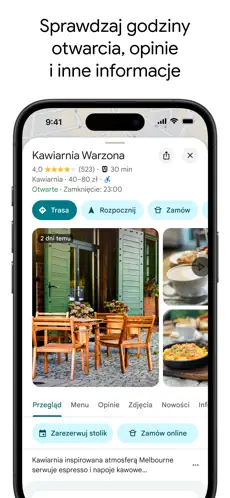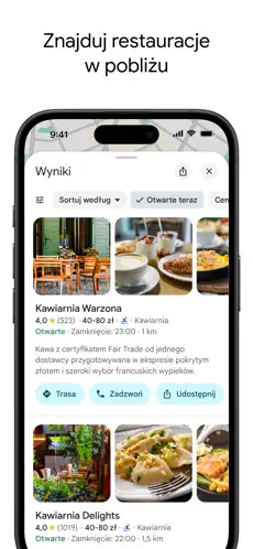 Odkrywaj świat i podróżuj bezpiecznie dzięki aplikacji Mapy Google. Znajdź najlepsze trasy piesze, rowerowe, samochodowe i komunikacji miejskiej z aktualnymi informacjami o ruchu drogowym i precyzyjną lokalizacją GPS. Odkrywaj ponad 250 milionów firm i miejsc — od restauracji, sklepów po usługi codzienne — wraz ze zdjęciami, opiniami i szczegółowymi informacjami.