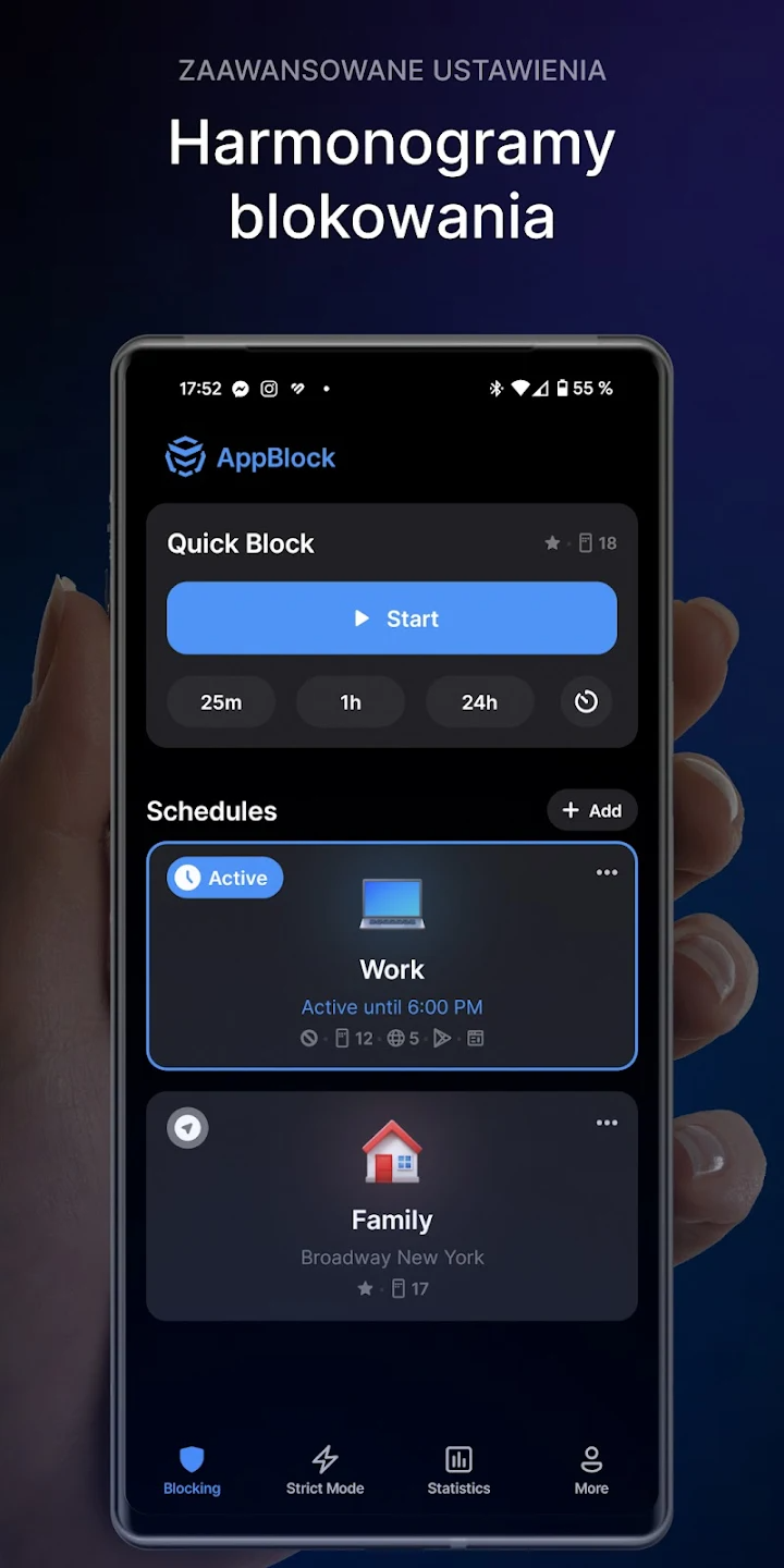 AppBlock umożliwia tworzenie spersonalizowanych zasad blokowania, które aktywują się automatycznie w określonym czasie lub miejscu. Aplikacja działa w tle i skutecznie uniemożliwia dostęp do wybranych aplikacji oraz stron, gdy użytkownik powinien skupić się na pracy, nauce lub odpoczynku.