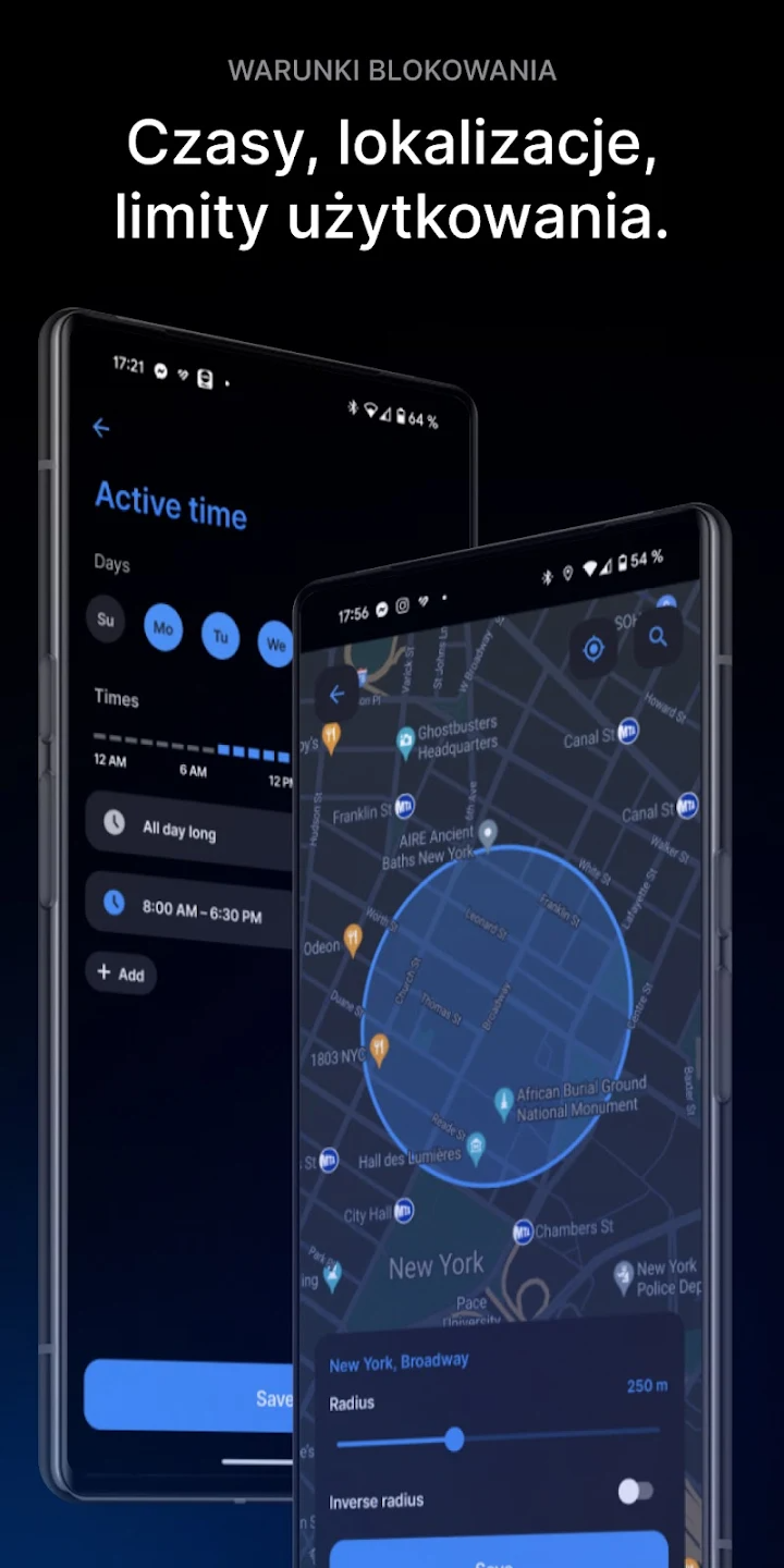 Automatyczne reguły blokowania po wykryciu określonego miejsca, np. pracy lub szkoły.