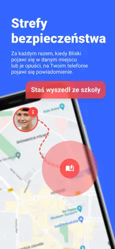 Alerty o opuszczeniu strefy – użytkownik otrzymuje powiadomienia, gdy bliska osoba opuści wcześniej zdefiniowaną strefę bezpieczeństwa, np. dom, szkołę czy miejsce pracy.