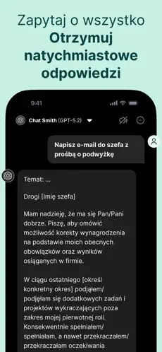 Chat Smith – Czat AI i Agent to aplikacja mobilna wykorzystująca technologię AI do prowadzenia rozmów z użytkownikiem oraz wspierania go w różnych zadaniach – od pisania tekstów po analizę informacji.