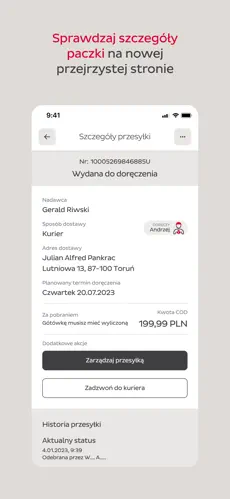Otrzymuj powiadomienia push, aktualizacje o dostawie z 30-minutowym wyprzedzeniem, a nawet zdjęcia przesyłki dostarczonej do „safe place”. W najnowszych wersjach dostępny jest również chatbot i opcja kontaktu bezpośrednio z kurierem.