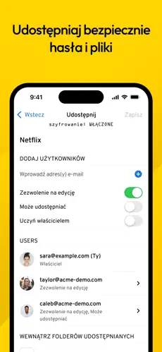 • Udostępnianie haseł – bezpieczne dzielenie się dostępami z członkami zespołu lub rodziny.