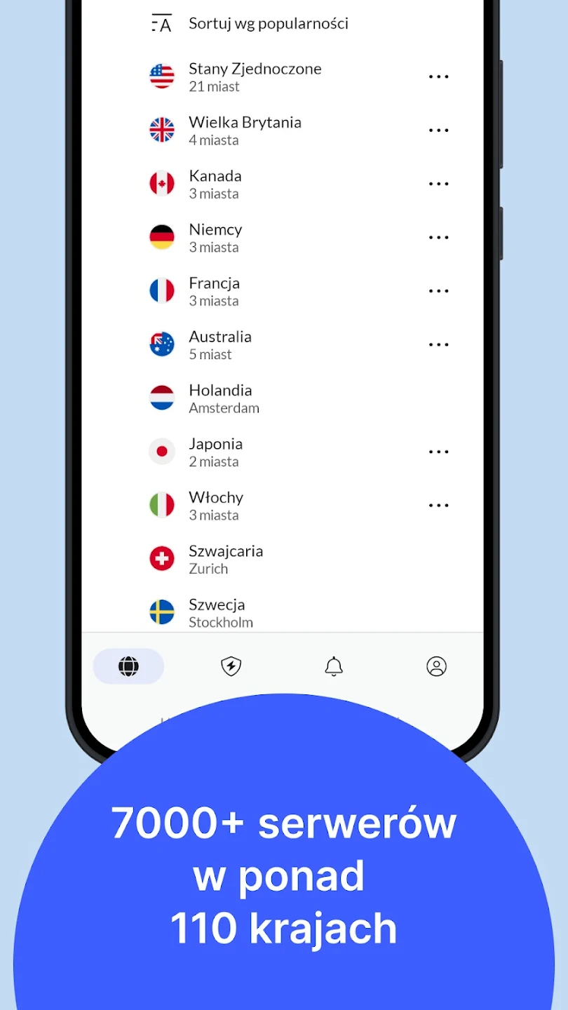 Ponad 6000 serwerów na całym świecie zapewnia stabilne, szybkie połączenia i możliwość wyboru lokalizacji według potrzeb użytkownika.