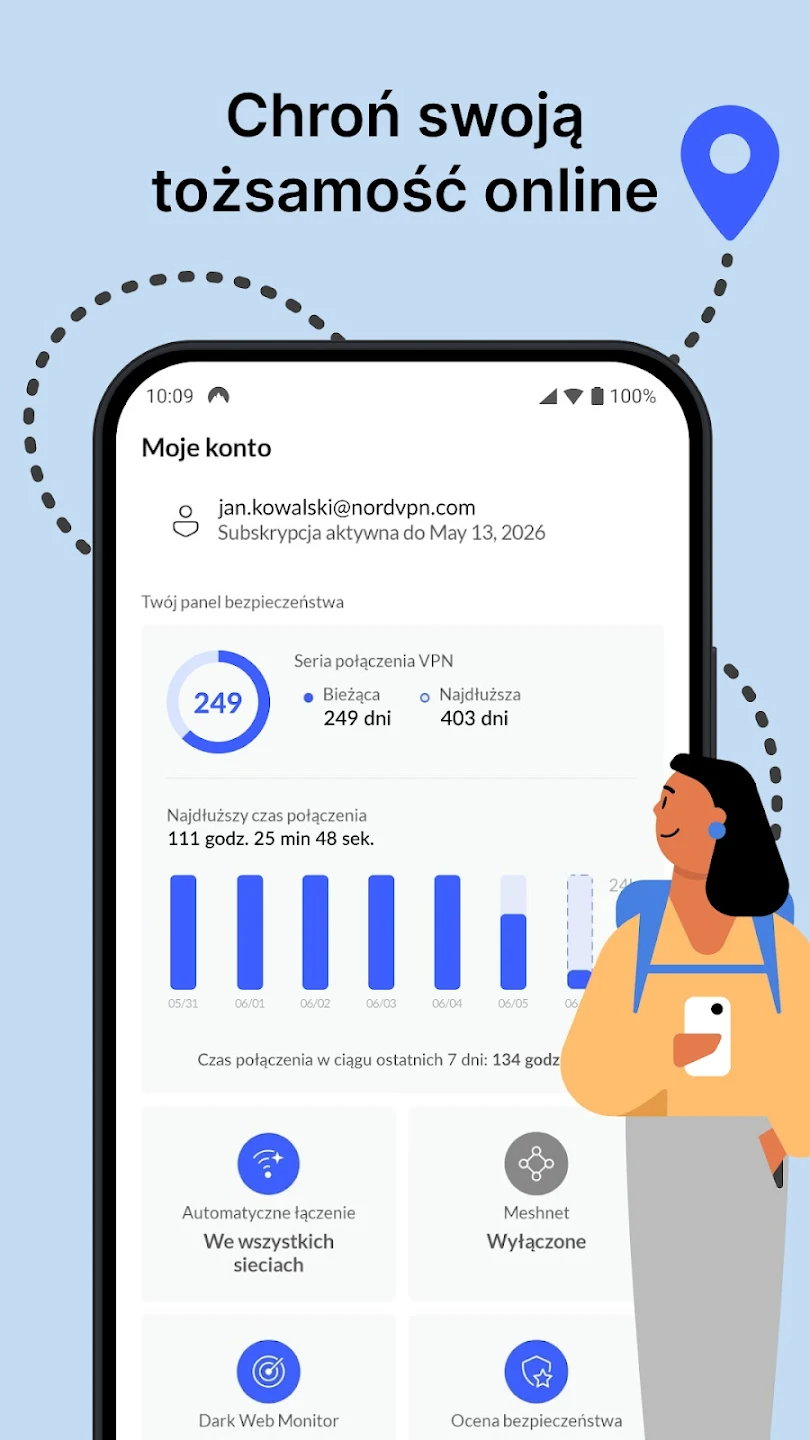 NordVPN to profesjonalna sieć VPN, która umożliwia ukrycie adresu IP, szyfrowanie ruchu internetowego oraz korzystanie z serwerów w ponad 100 krajach. Aplikacja jest dostępna na smartfony, komputery, tablety i routery, a jej obsługa jest niezwykle łatwa – nawet dla początkujących.