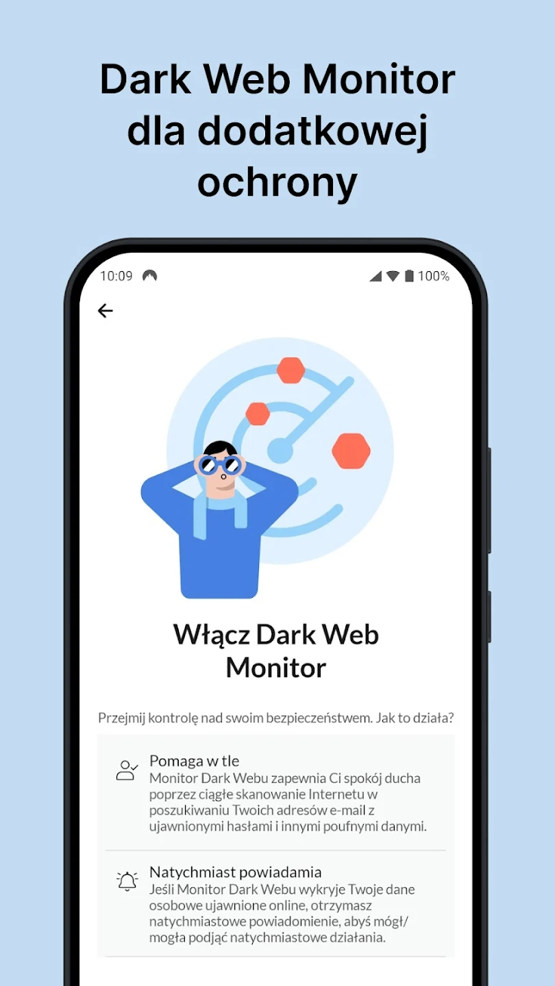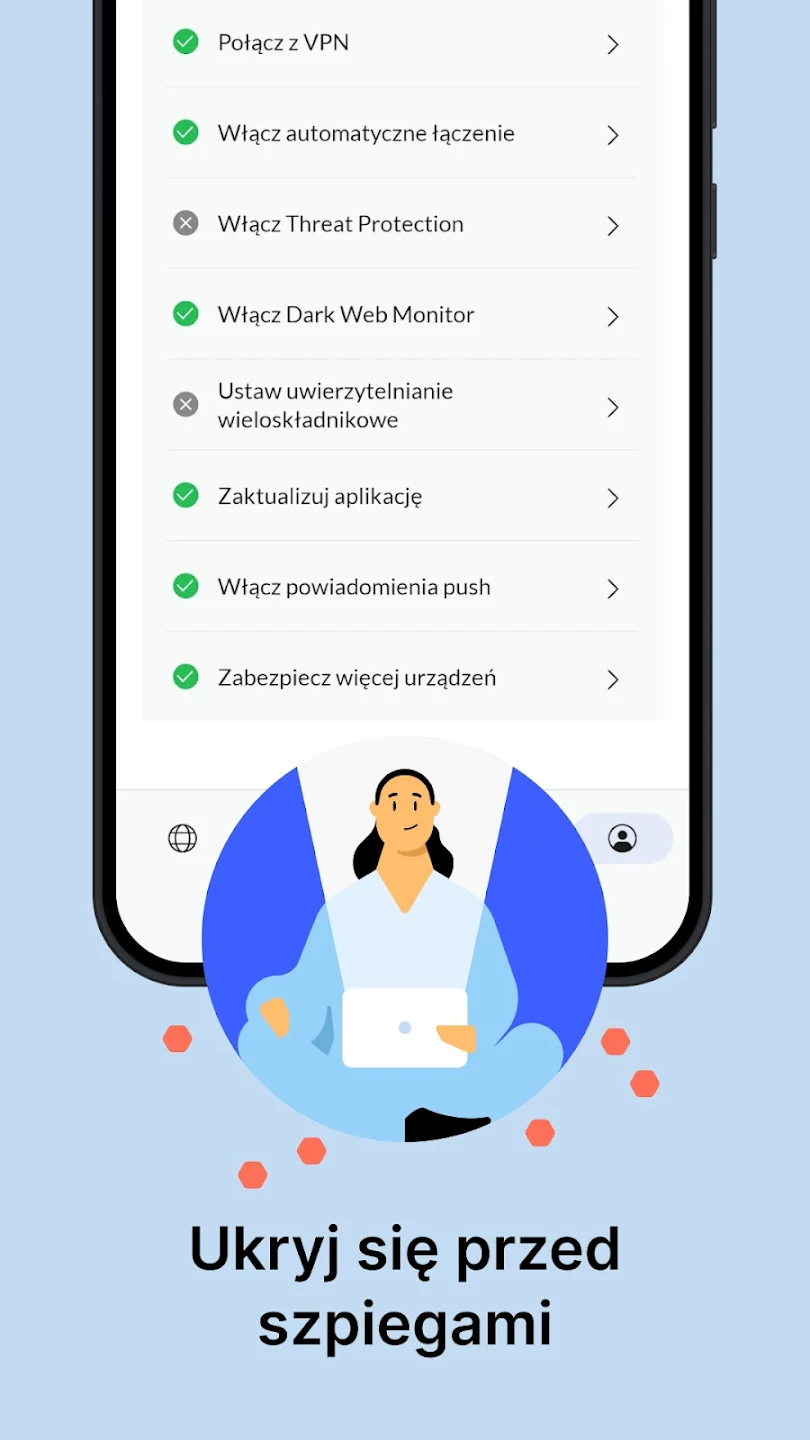 Funkcja Threat Protection blokuje złośliwe strony, reklamy i trackery, zwiększając bezpieczeństwo codziennego korzystania z internetu.