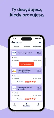 Tikrow to idealna aplikacja dla osób szukających pracy dorywczej bez skomplikowanych formalności. Wszystkie umowy i rozliczenia odbywają się online, a użytkownik otrzymuje jasne warunki współpracy już na etapie wyboru zlecenia. Aplikacja zapewnia bezpieczeństwo, transparentność oraz minimum biurokracji.