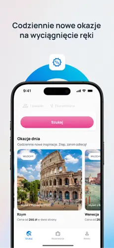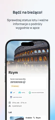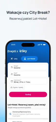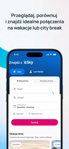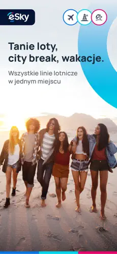 eSky – Tanie loty i Wakacje to aplikacja podróżnicza, która ułatwia planowanie podróży w Polsce i na całym świecie. Dzięki niej szybko znajdziesz tanie bilety lotnicze, zarezerwujesz hotele, wynajmiesz samochód oraz skorzystasz z gotowych pakietów wakacyjnych. Wszystko w jednym miejscu, zawsze w Twoim telefonie.
